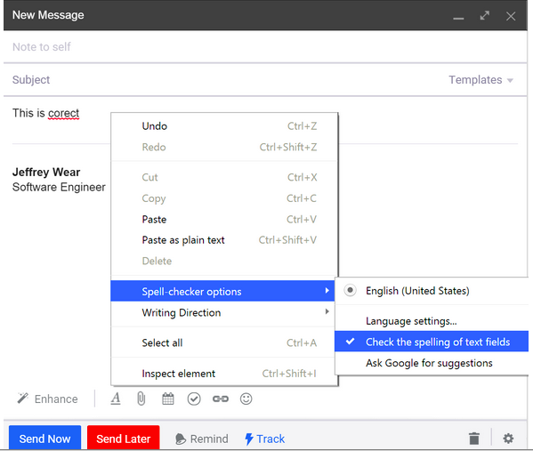 It only took like three of my emails to go out before I noticed the misspelled words and that Google wasn't doing a spell check for me. I checked all kinds of settings and didn't see any of them which would suggest I had turned off this feature. I then went to compose a message and right-clicked on the body of the message. From there, I found an option called 'Spell-checker options' and the sub-option of 'Check the spelling of text fields'. After selecting this option, I was able to get my automatic spell-checking back.